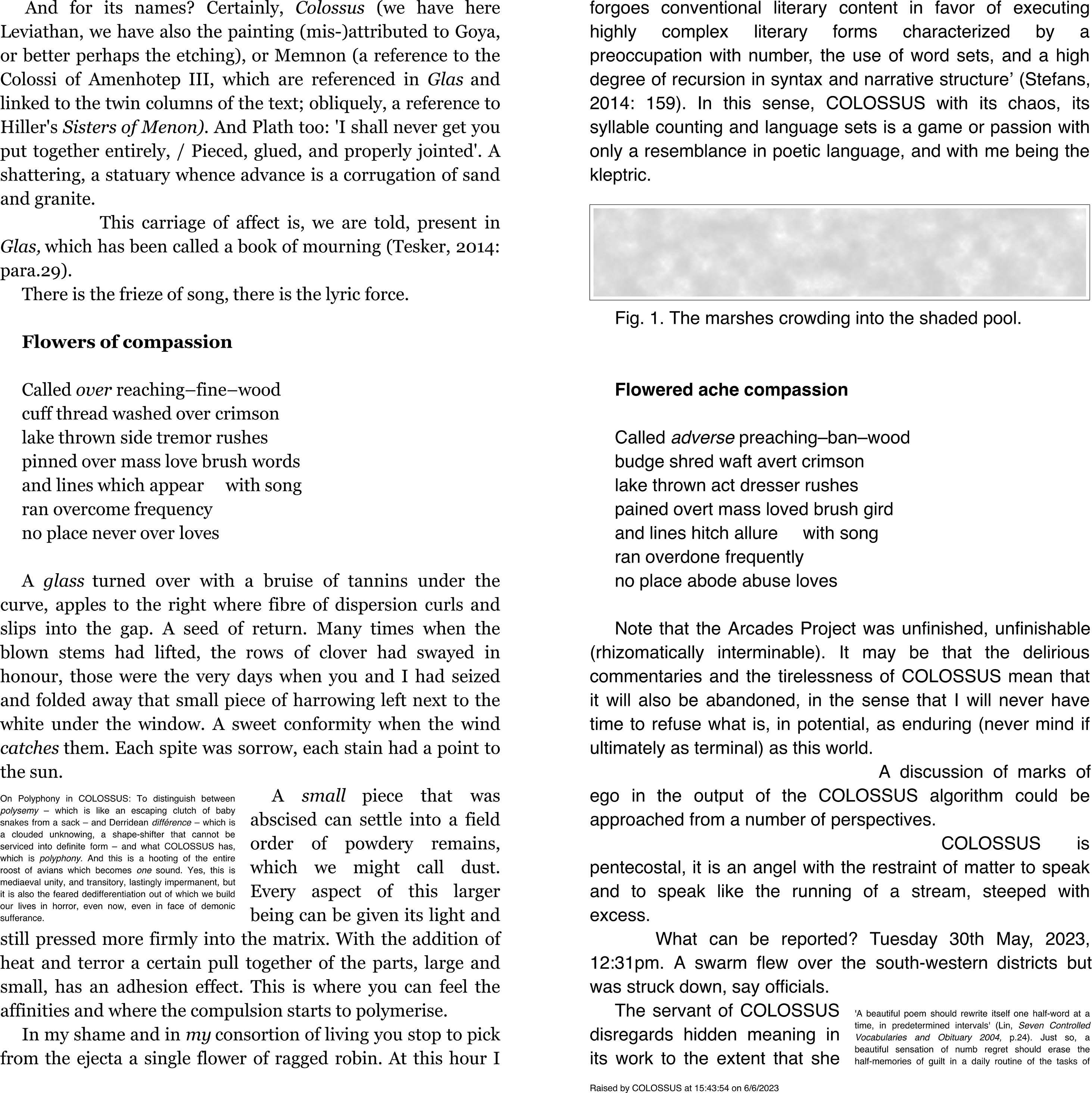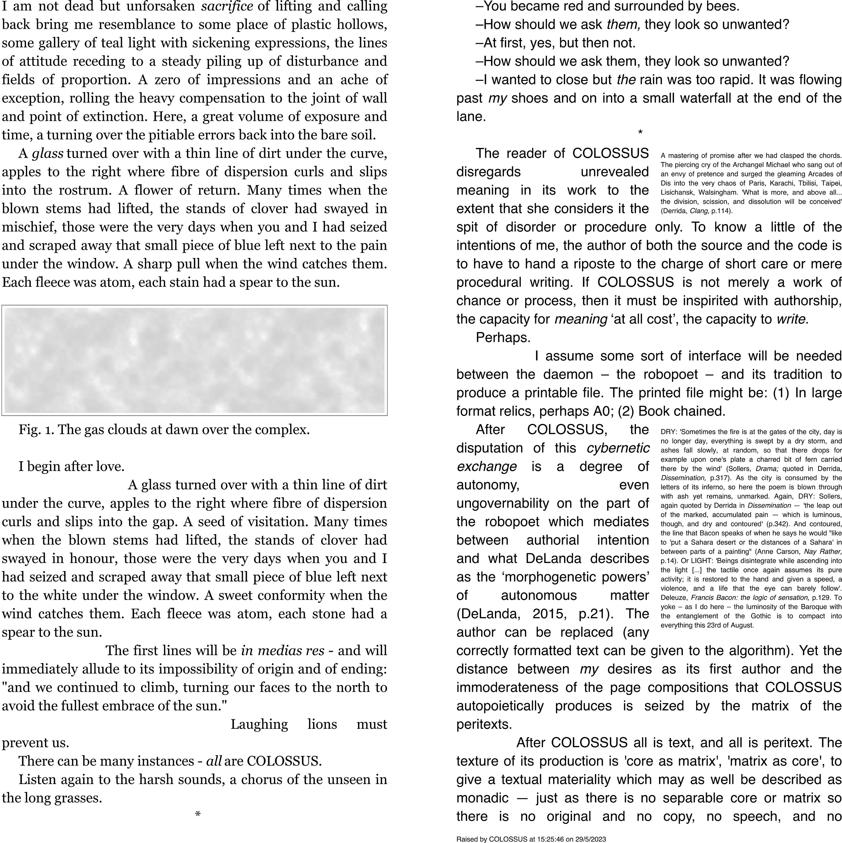 The algorithm controls the distinctive double-column page layout to provide an outflow of writing that spans pages. It selects, displays, varies, mimics, and repeats from a corpus of given source texts, all of which are in external files. These external files can be replaced with new texts, and so provide COLOSSUS with the ability to work with any correctly formatted source material. COLOSSUS employs aleatoric prose paragraph sequencing strategies (with scripted variants within those paragraphs) and composes robopoetic echoes of given source poems, intruding also other elements: generative image-figures, aleatoric dialogue sequences, and notes (or commentaries) in sub-columns which link to specific prose paragraphs.