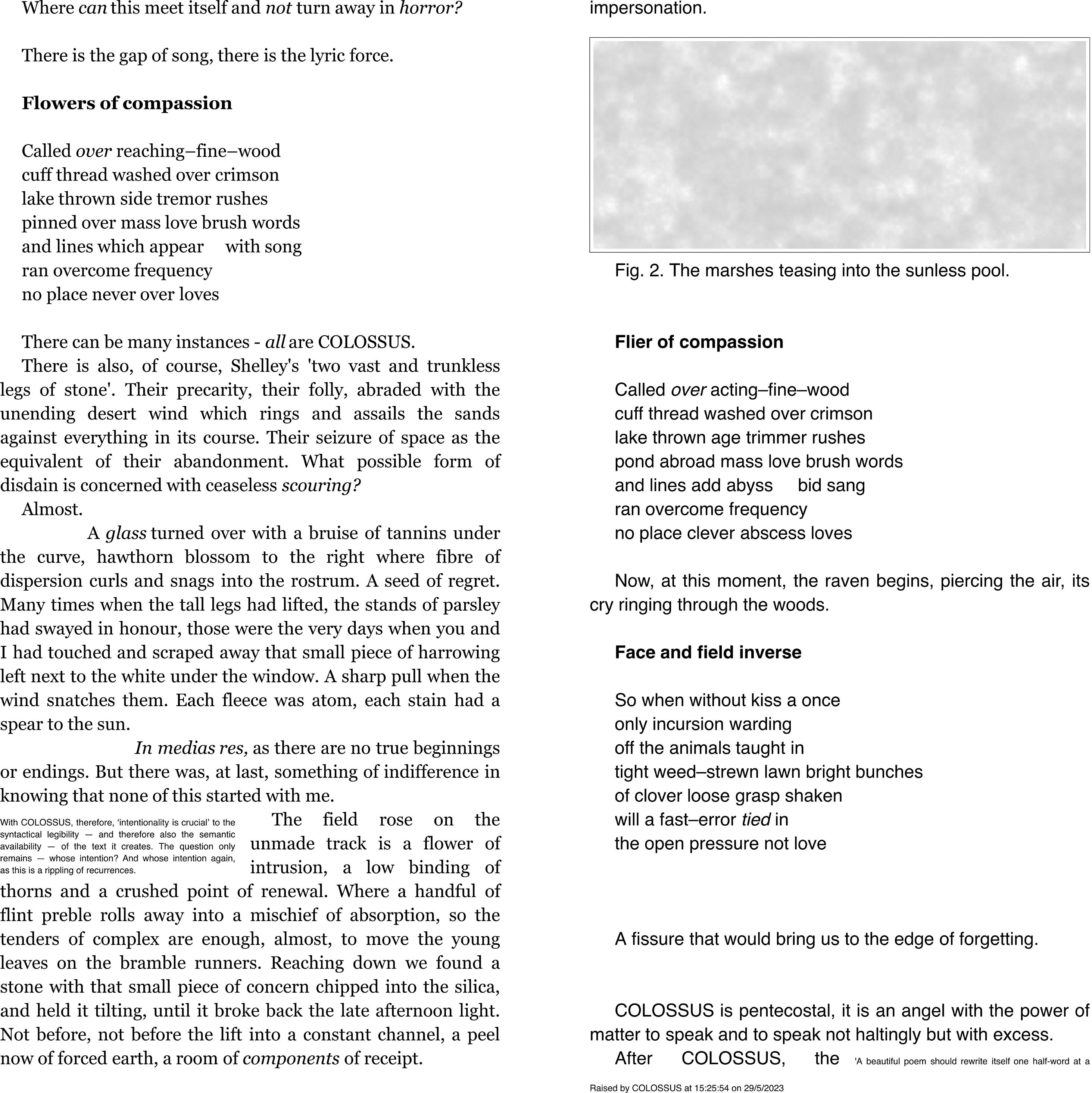 COLOSSUS mimics the double column structure of Jacques Derrida's Glas (1974), including the ways in which that uses its own sub-columnar commenting strategies. Glas is chosen here as a model of the multiplication of discourse, displayed through graphic and typographic means, and the critical alignment with COLOSSUS extends to the parallelism of its voices, uses of asides and qualifications, and faults or breaks in the flow of ideas that are signified in the layout of the pages - and to its uses of chance in the juxtaposition and coherence of its elements. To mimic Glas as comprehensively as possible, COLOSSUS sustains page to page overspill of paragraph, poem, commentary, and dialogue to produce a continuous composition.