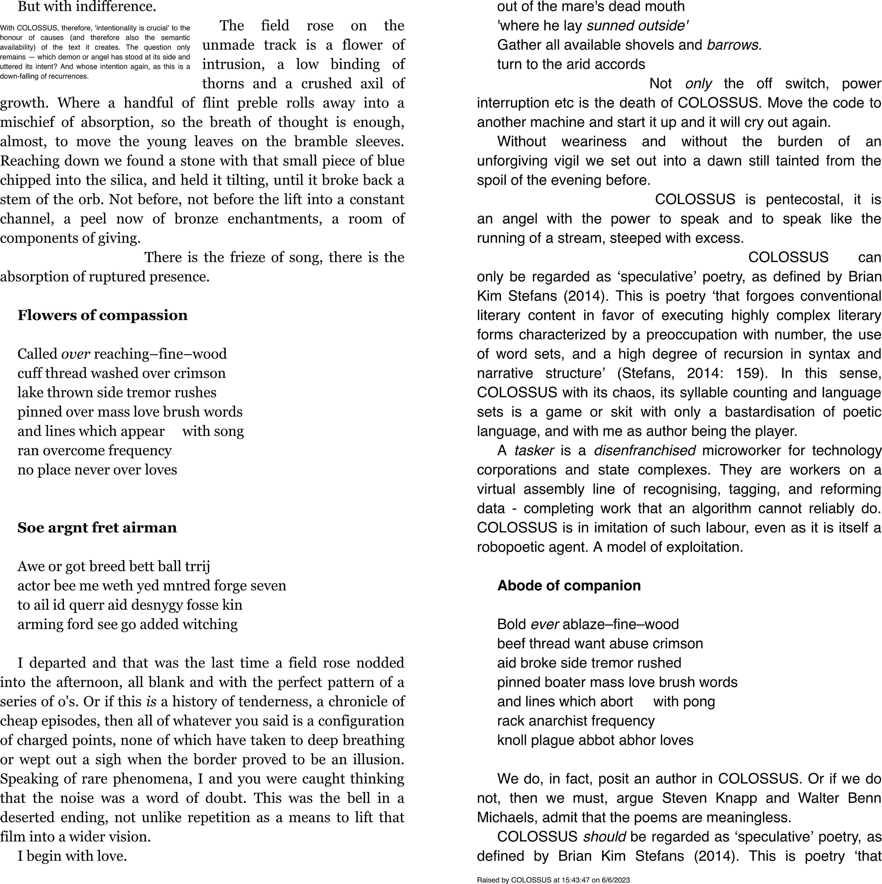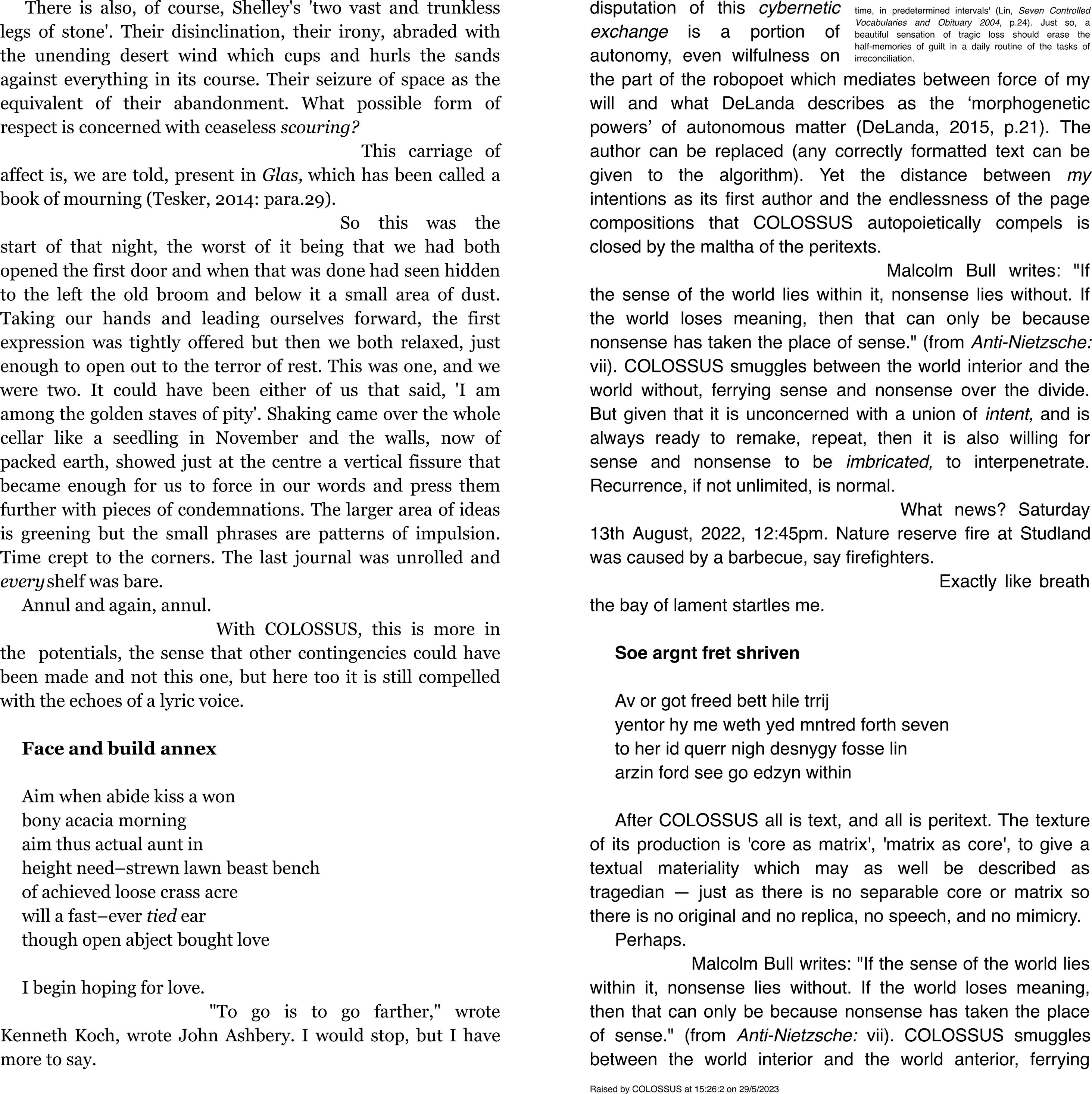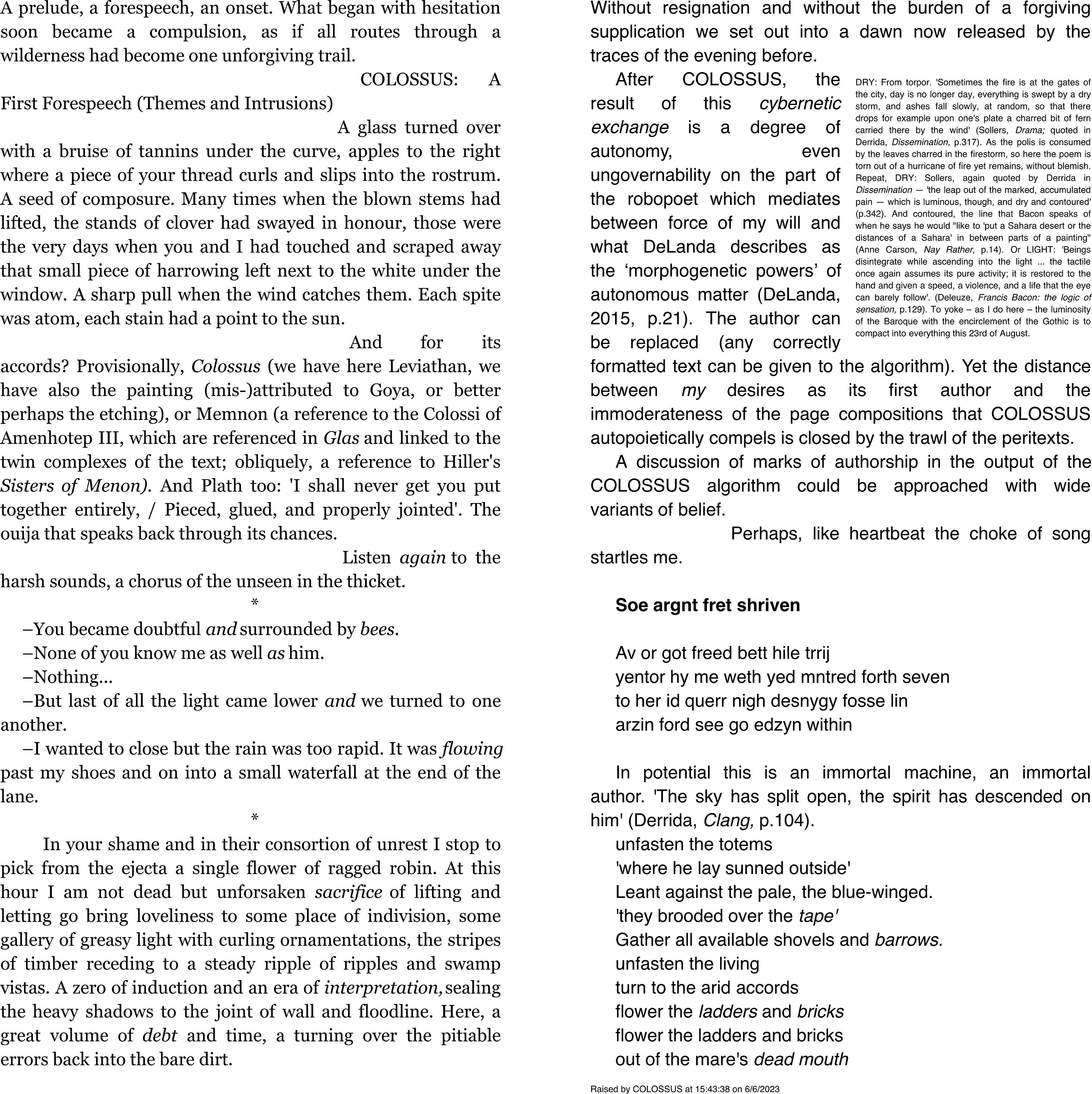 COLOSSUS is a machine of potential literature that will indefinitely compose and layout pages until stopped by user action, power interruption, computer crash, or hardware failure. COLOSSUS probes its origin, its purpose, and its regard. It writes and looks back to itself across the two columns, and the echoes between are its myth of its becoming.