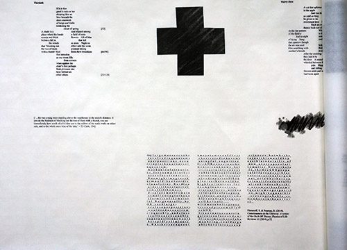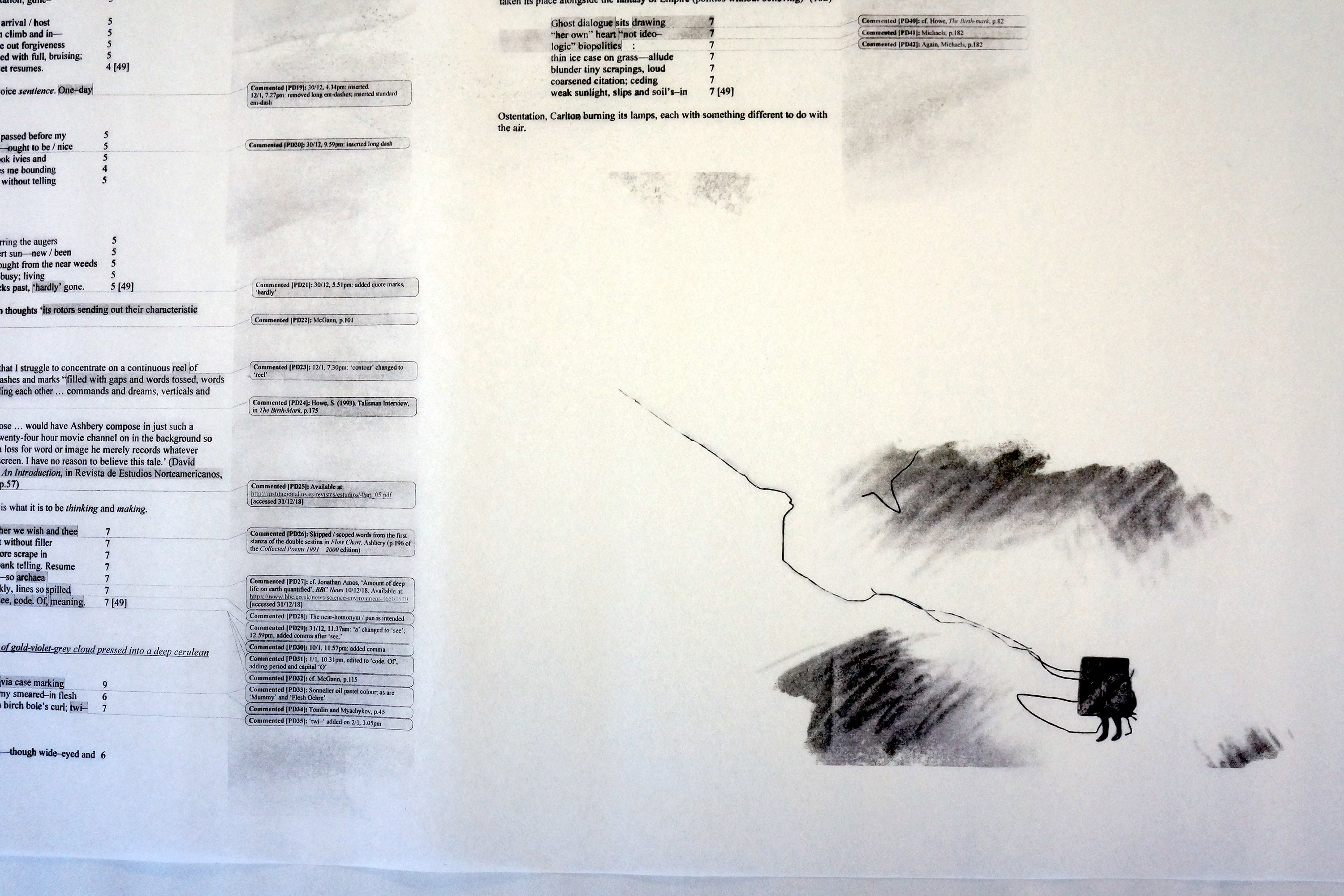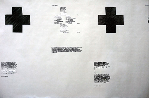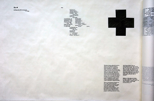 The poetry follows a formal constraint of multiples of seven syllables, and the layered strips of paper integrate these poems with multi-modal commentaries, quotations, and visual elements. The foregrounded materiality has specific resonance with some of the appropriated texts and the panoramic silhouetted landscapes are reminiscent of Chinese scroll paintings. The sheets meet and cross in the densest layering in the centre of the cruciform arrangement, which also contains the only colour, a patch of cyan. Stones placed across the work perform a practical function (the papers are light and will move if not weighted), but in addition provide overt materiality. Erasures and obscured text enact a partial deletion or dematerialisation of the writing. The result is what can be termed an unclosed work without definitive form (the component papers can be rearranged, layered differently, even appended or removed), despite the fixity of each page as a hand-made printed artefact.