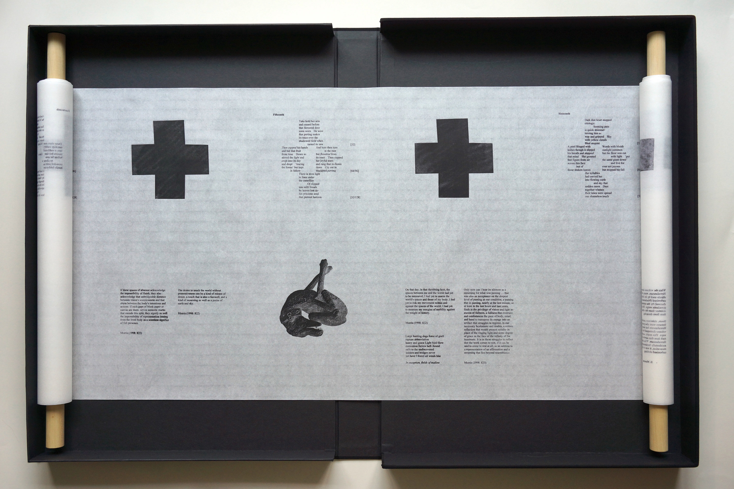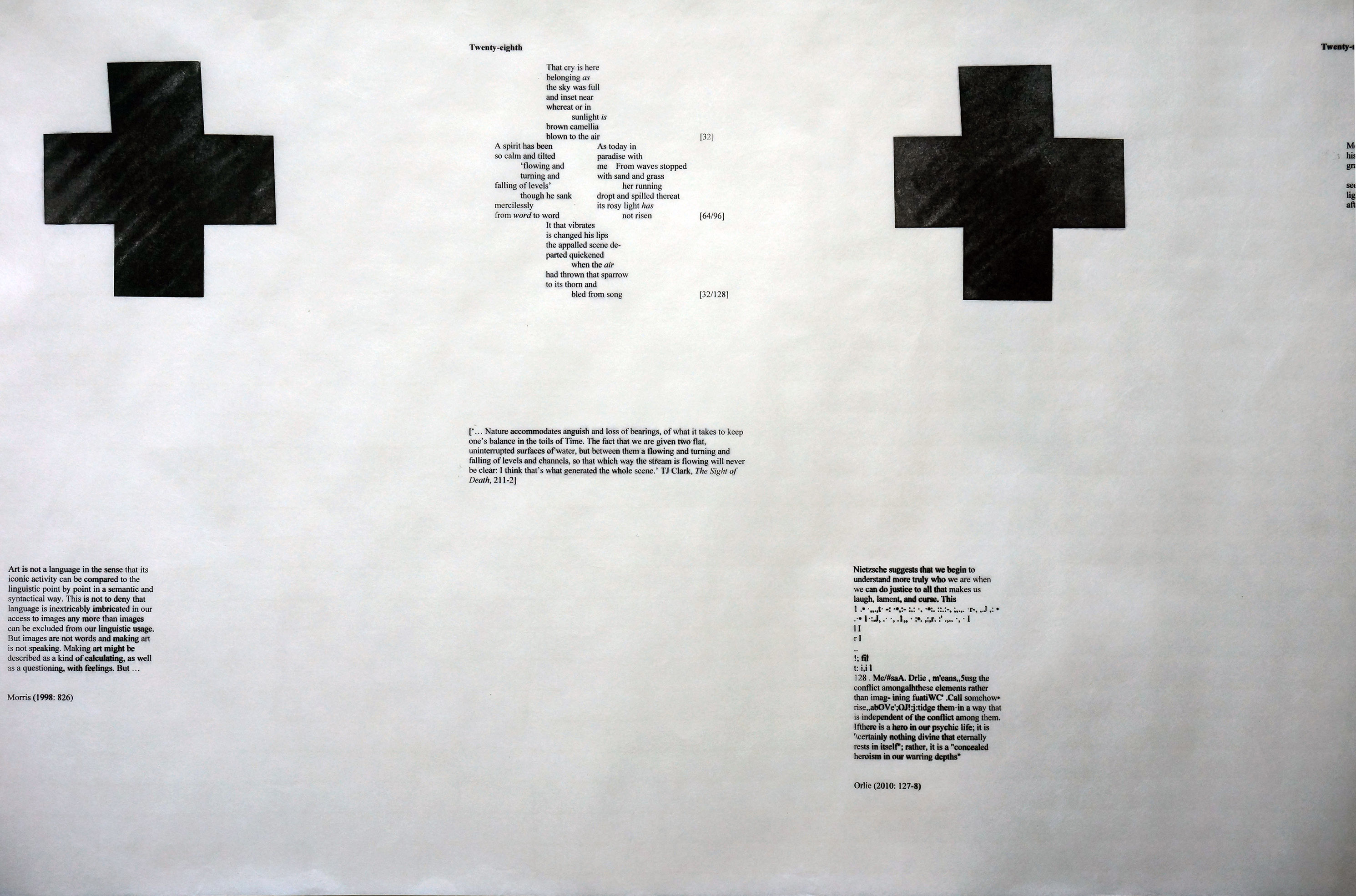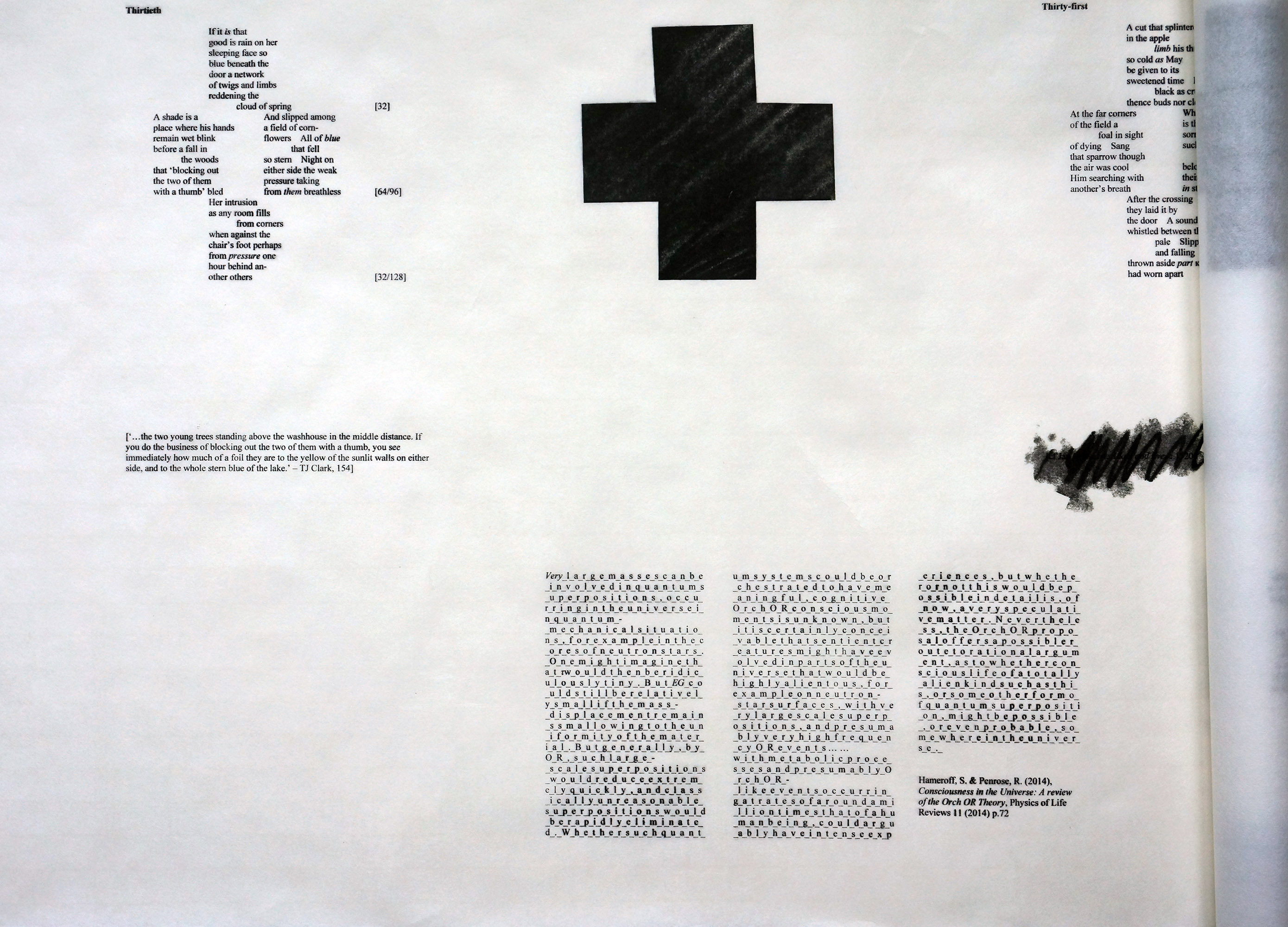 Thirty-three cruciform poems (thirty-two are complete, the thirty-third is a fragment) are hand-printed along a single long strip or scroll of paper. They are interleaved with black crosses whose sheared morphology recalls Kasimir Malevich's painting Black Cross (1915). Below is a parallel sequence of further poem-fragments, authorial commentaries and interjections, quotations (sometimes glitched) from among others: the papers of Stuart Hameroff and Roger Penrose on their contested theory of quantum consciousness; Robert Morris' essay Cezanne's Mountains (1998); Melissa A. Orlie's new-materialist Impersonal Matter (2010); Pliny the Younger's letters recalling the eruption of Vesuvius. Further graphic elements include Malevich's painting Running Man (Sensation of Danger) (1930), and an image of the cast of a dog from Pompeii. It is displayed such that only a limited portion of the work can be seen at one time, expecting reader action to turn through the scroll contained within its box.