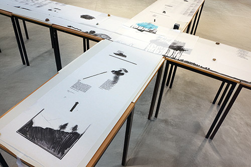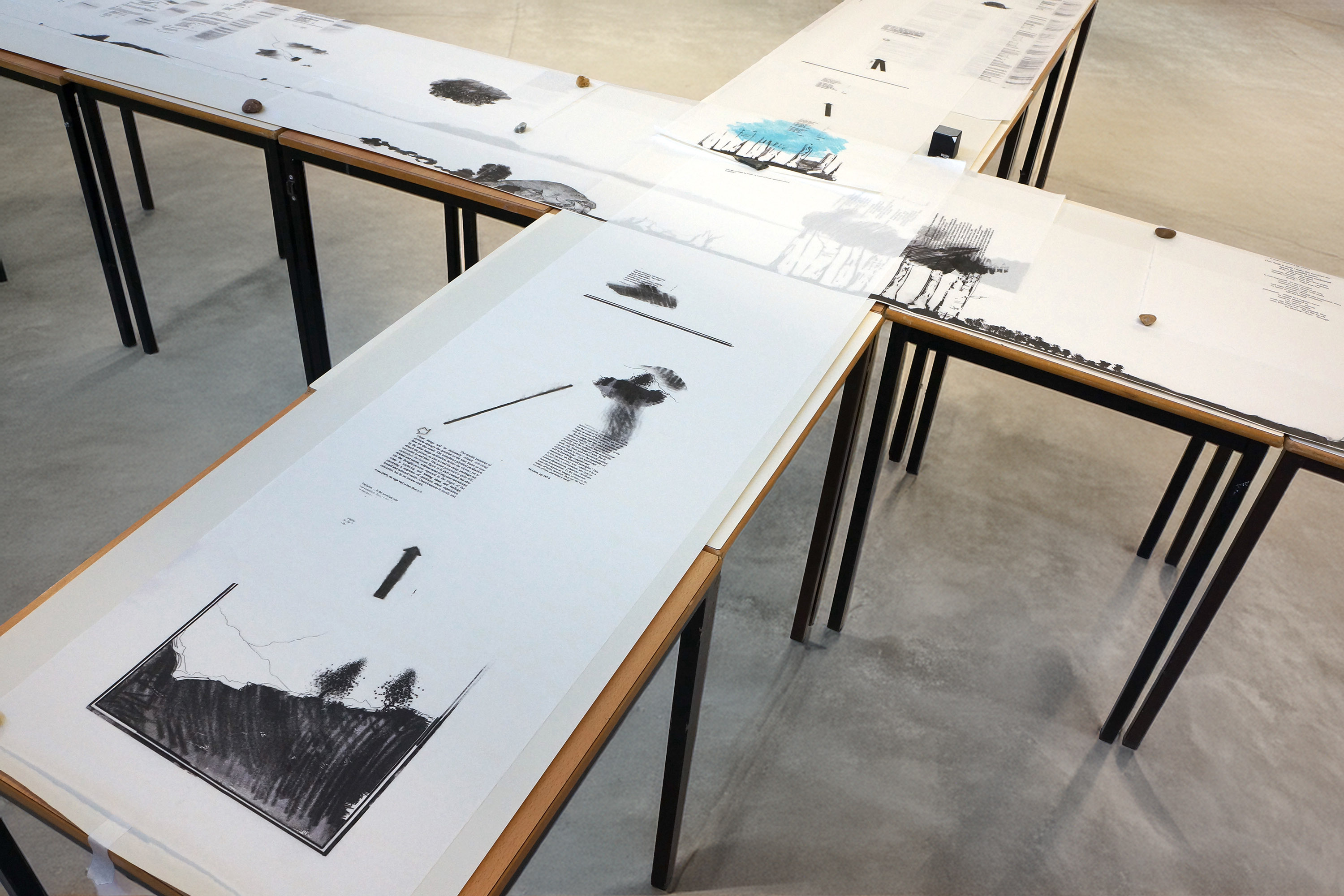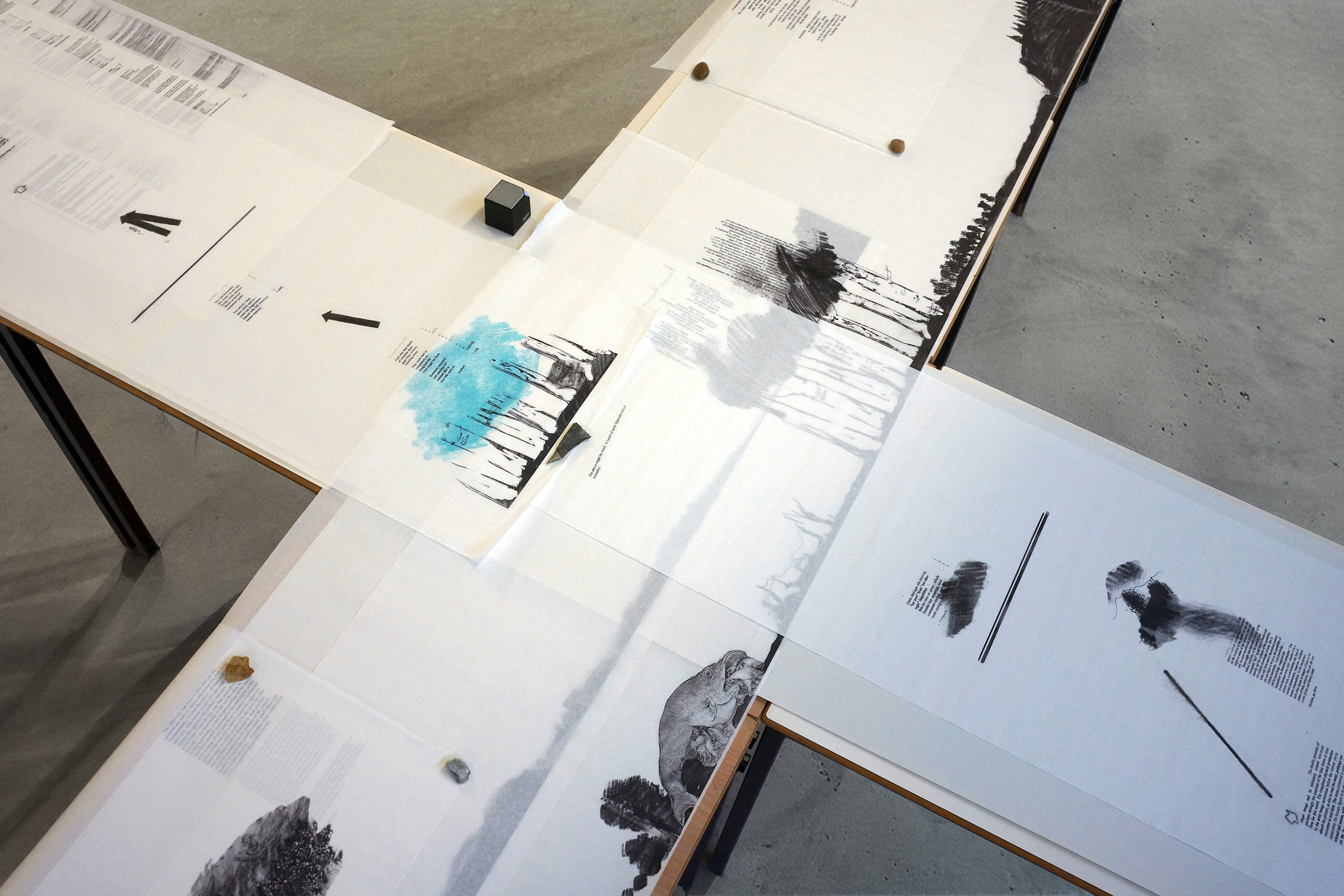 Carbon toner and solvent transfer on mulberry paper, stones, modular tables. Overall dimensions approximately 600 x 600 x 70 cm. Total of printed papers 46 x 1500 cm.