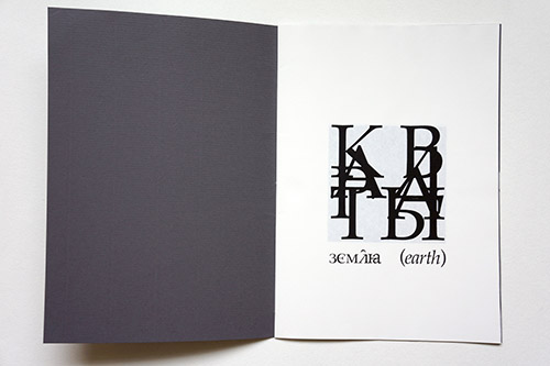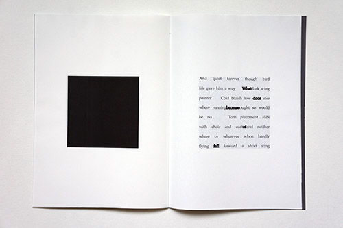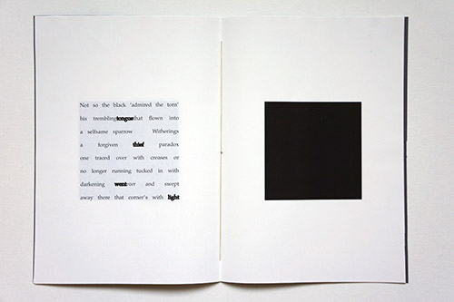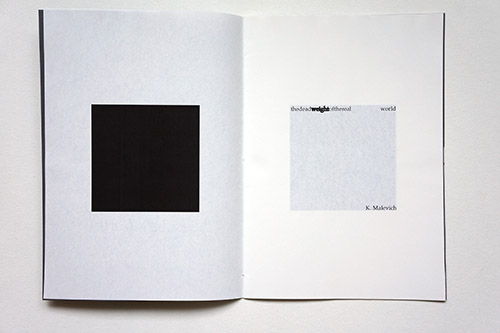 Kwadrats 7 is one part of an eight-part poem sequence as a unique hand-made pamphlet (the other seven were not realised in print). The full poem consists of eight sequences of poem-text, each divided into eight stanzas, each of which is of eight lines of eight syllables. The written and visual-material contents of Kwadrats 7 address the work and manifesto writings of the artist Kasimir Malevich, and in printed form it uses perfect registration of justified text and repeated black squares, aligned through the translucent sheets of its pages.
