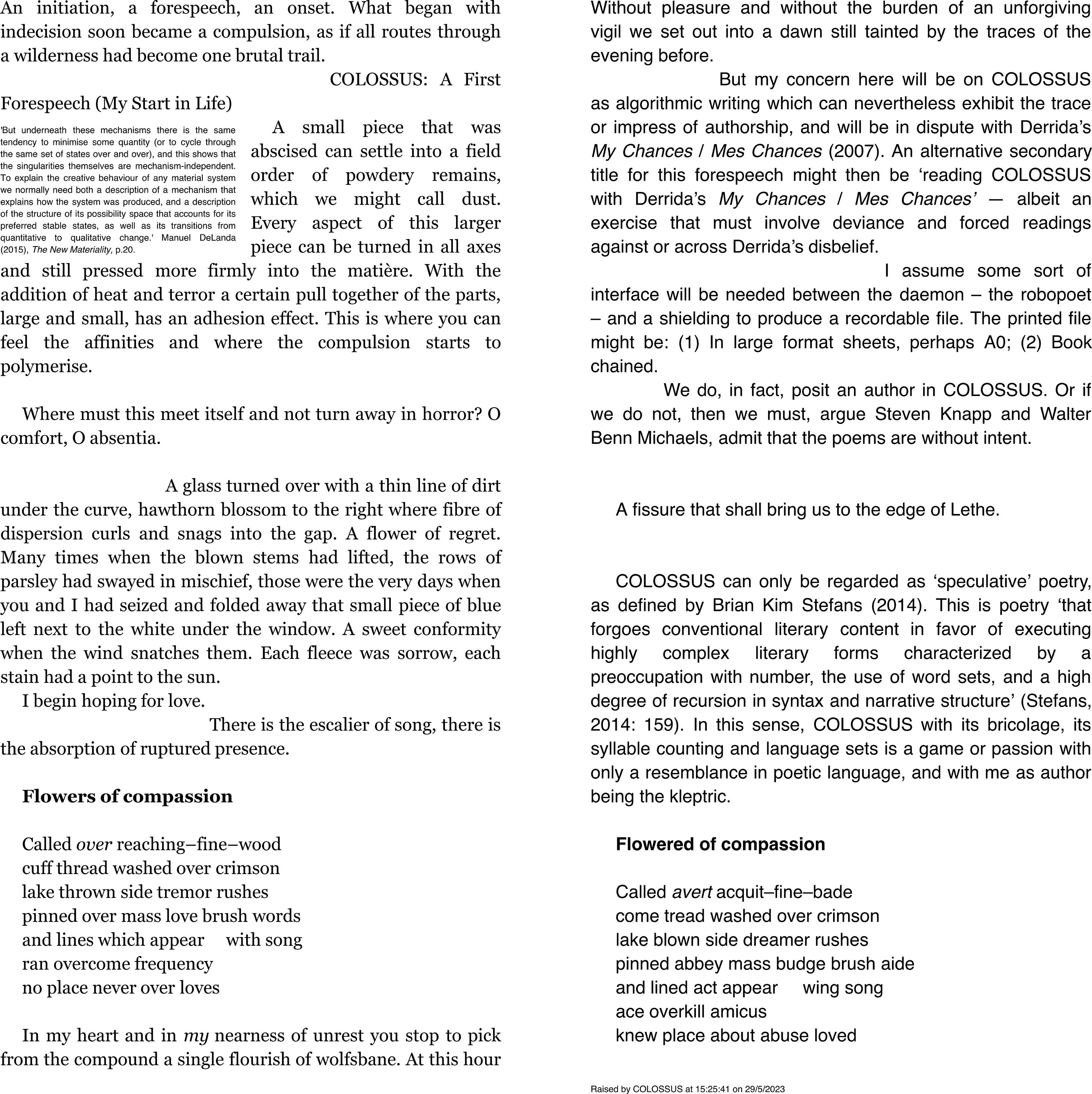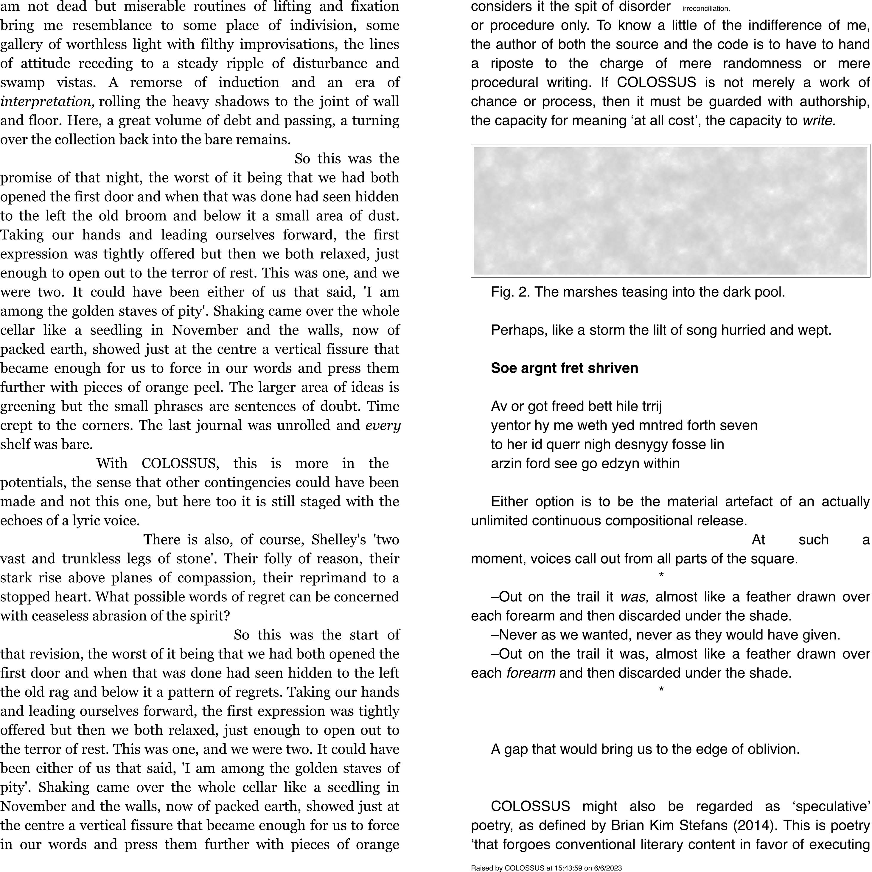 The algorithm controls the distinctive double-column page layout to provide an outflow of writing that spans pages. It selects, displays, varies, mimics, and repeats from a corpus of given source texts, all of which are in external files. These external files can be replaced with new texts, and so provide COLOSSUS with the ability to work with any correctly formatted source material. COLOSSUS employs aleatoric prose paragraph sequencing strategies (with scripted variants within those paragraphs) and composes robopoetic echoes of given source poems, intruding also other elements: generative image-figures, aleatoric dialogue sequences, and notes (or commentaries) in sub-columns which link to specific prose paragraphs.