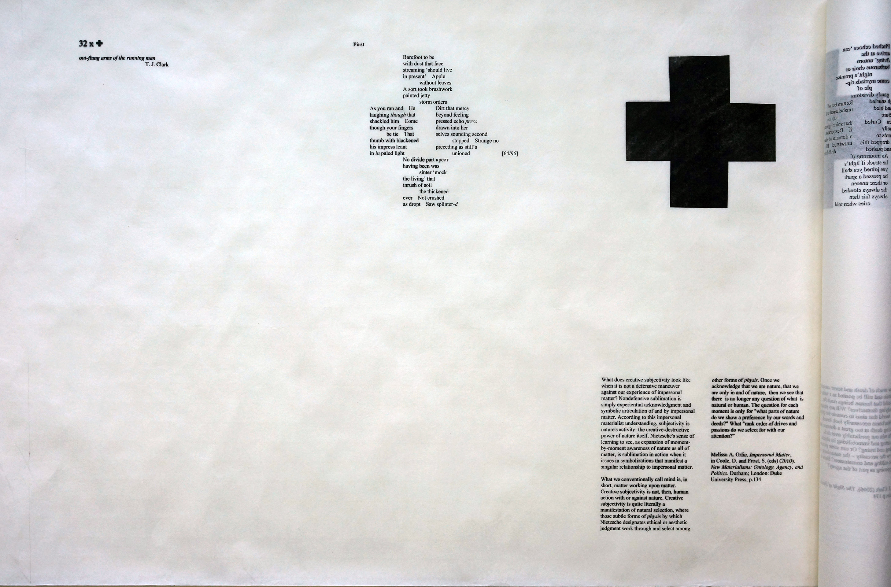 Thirty-three cruciform poems (thirty-two are complete, the thirty-third is a fragment) are hand-printed along a single long strip or scroll of paper. They are interleaved with black crosses whose sheared morphology recalls Kasimir Malevich's painting Black Cross (1915). Below is a parallel sequence of further poem-fragments, authorial commentaries and interjections, quotations (sometimes glitched) from among others: the papers of Stuart Hameroff and Roger Penrose on their contested theory of quantum consciousness; Robert Morris' essay Cezanne's Mountains (1998); Melissa A. Orlie's new-materialist Impersonal Matter (2010); Pliny the Younger's letters recalling the eruption of Vesuvius. Further graphic elements include Malevich's painting Running Man (Sensation of Danger) (1930), and an image of the cast of a dog from Pompeii. It is displayed such that only a limited portion of the work can be seen at one time, expecting reader action to turn through the scroll contained within its box.